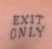 It then dawns on her then that this is the cleverest thing she has ever thought of and she begins to consider it seriously. Furthermore, she thinks the tat will be an excellent conversation starter with guys. Since the only conversations that she enjoys, and can take an active part in involve sex. This tattoo would be the perfect tool for her. She could show it to a hot guy, he would laugh, because who wouldn't it is such a hilarious saying. Then she could tell him how much she "hates when a guy tries to put his dick in my asshole". This would be a natural lead in for her to prattle on about how much she enjoys sex in her vagina, what positions she likes, how good she is at sucking dick ect. God why didn't she think of this earlier this is the perfect tat. She goes to the tattoo parlor and tells the heroin addict behind the counter what she wants done. He of course thinks this is immensely clever, and totally rad. She goes in the back and pulls down her pants (further than need be because, well, she is a whore). The heroin addict stencils in "Exit Only" over her ass crack. He checks it a few times for spelling, and then begins burning the ink into her flesh. She is in pain, but she is completely convinced that this is an awesome tat.